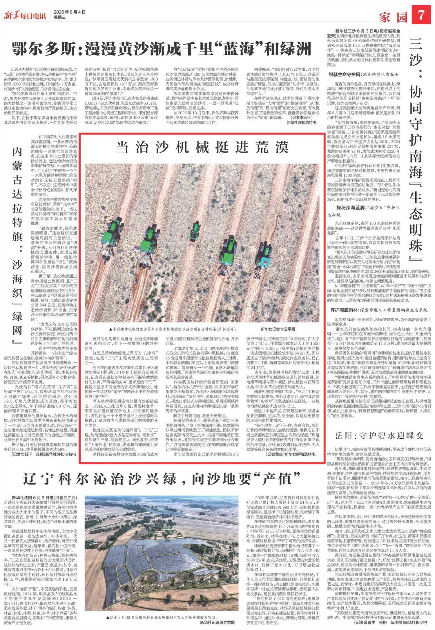 2025年6月4日,《新華每日電訊》第7版刊發(fā)題為《當治沙機械挺進荒漠》一文,報道了內(nèi)蒙古鄂爾多斯毛烏素沙地區(qū)域聯(lián)防聯(lián)治(蒙、陜、寧)沙化土地綜合治理項目創(chuàng)新應用系列機械化沙障鋪設裝備,適應復雜地形,“三北”工程治沙效率大幅提高。毛烏素沙地、庫布其沙漠等黃河“幾字彎”攻堅戰(zhàn)的核心區(qū)域,一些地市治沙機械化率達60%以上。