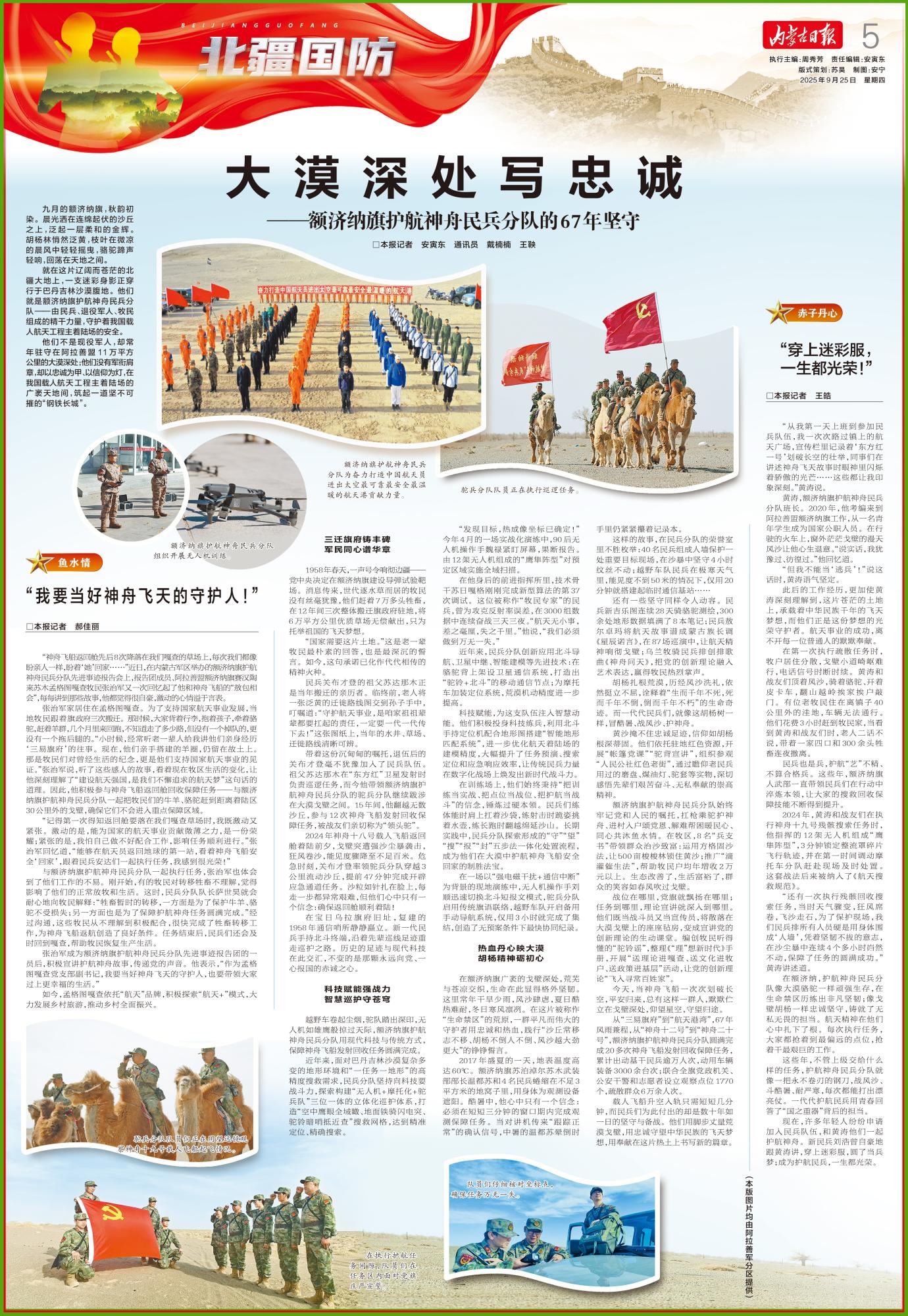 還有一些堅(jiān)守同樣令人動(dòng)容。民兵新吉樂(lè)圖連續(xù)28天騎駱駝測(cè)繪,300余處地形數(shù)據(jù)填滿了8本筆記;民兵敖爾卓瑪將航天故事譜成蒙古族長(zhǎng)調(diào)《星辰諾言》,在87場(chǎng)巡演中,讓航天精神響徹戈壁;烏蘭牧騎民兵排創(chuàng)排歌曲《神舟問(wèn)天》,把黨的創(chuàng)新理論融入藝術(shù)表達(dá),贏得牧民熱烈掌聲。