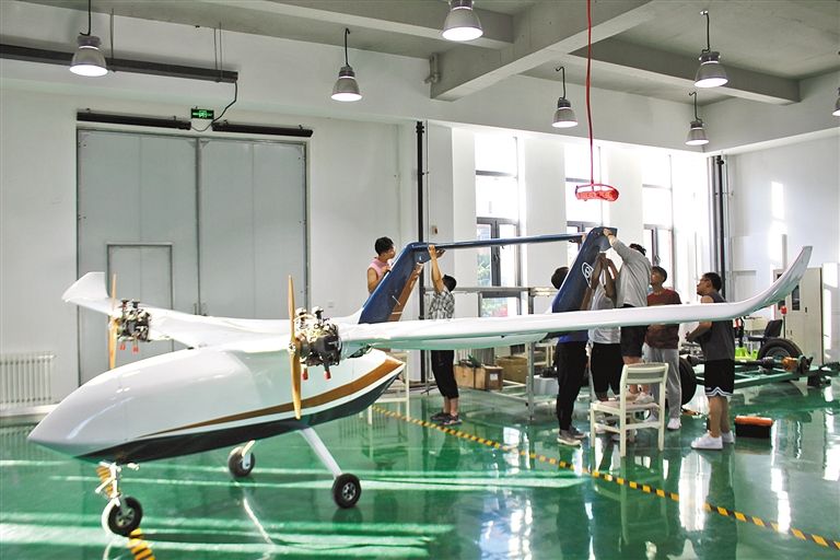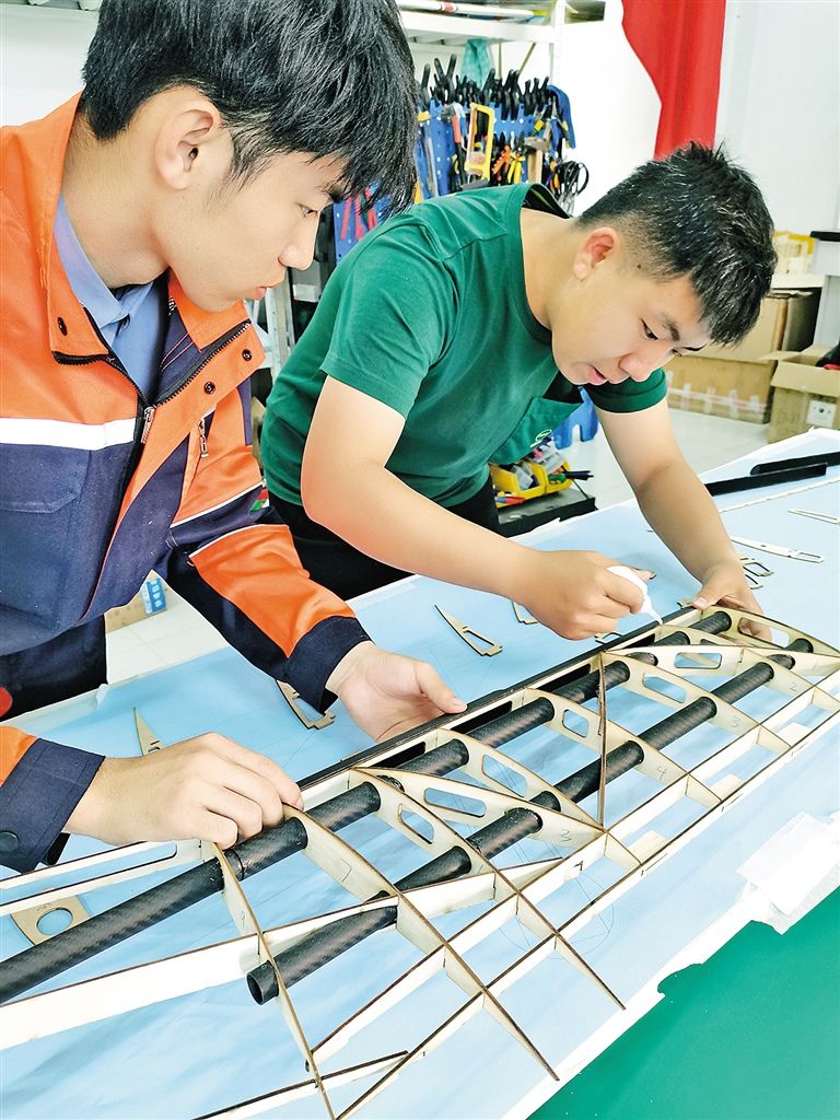 內(nèi)蒙古工業(yè)大學(xué)智能裝備研究院工作人員正在進(jìn)行TS300長(zhǎng)航時(shí)大載重固定翼無人運(yùn)輸機(jī)室內(nèi)組裝工作。