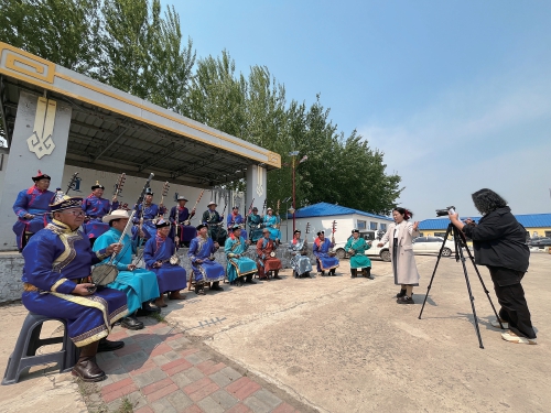 5月21日,記者走進吐列毛杜鎮(zhèn)鐵特格嘎查,恰巧遇到鎮(zhèn)黨委宣傳委員高薩日娜正在拍攝最新一期的《村聞聯(lián)播》。嘎查小舞臺上,17名村民身著蒙古族服飾,手持四胡演奏著《烏力格爾三部曲》《牧民歌唱共產(chǎn)黨》等悠揚的樂曲。他們大部分年齡都在五六十歲,來自當(dāng)?shù)氐睦ざ祭渌暮鷧f(xié)會。該協(xié)會共有60余名會員,多年來以四胡彈奏、科爾沁民歌、烏力格爾(一種蒙古族的曲藝說書形式)、好來寶說唱等各種方式,參與著吐列毛杜鎮(zhèn)文化志愿服務(wù)。