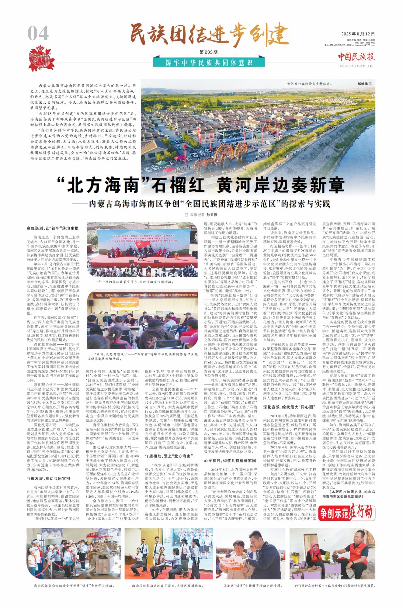 2025年8月12日,《中國民族報》第4版刊發(fā)整版文章《“北方海南”石榴紅 黃河岸邊奏新章——內(nèi)蒙古烏海市海南區(qū)爭創(chuàng)“全國民族團(tuán)結(jié)進(jìn)步示范區(qū)”的探索與實踐》,報道了自2018年成功創(chuàng)建“自治區(qū)民族團(tuán)結(jié)進(jìn)步示范區(qū)”后,內(nèi)蒙古烏海市海南區(qū)各族干部群眾在爭創(chuàng)“全國民族團(tuán)結(jié)進(jìn)步示范區(qū)”的新征程上凝心聚力再出發(fā),共同唱響民族團(tuán)結(jié)進(jìn)步主旋律。
