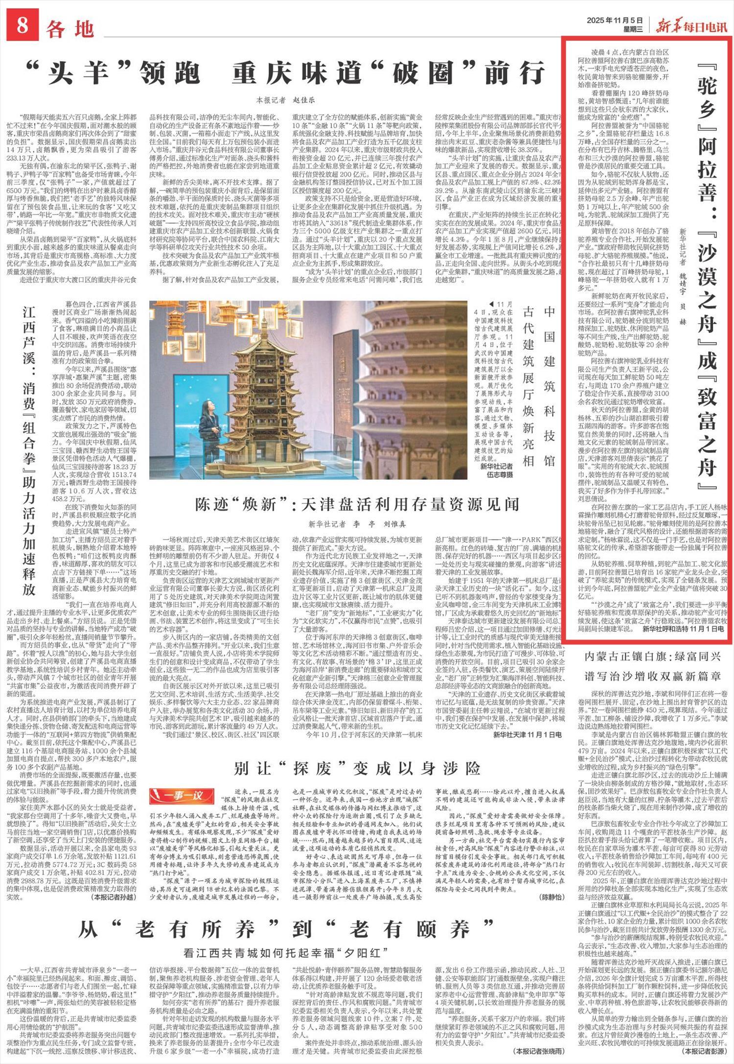 2025年11月5日,《新華每日電訊》第8版刊發(fā)題為《“駝鄉(xiāng)”阿拉善:“沙漠之舟”成“致富之舟”》的文章,報道了阿拉善盟被譽(yù)為“中國駱駝之鄉(xiāng)”,駱駝存欄量達(dá)16.8萬峰,占全國存欄量的三分之一。預(yù)計到今年底,阿拉善盟駝產(chǎn)業(yè)全產(chǎn)業(yè)鏈產(chǎn)值將突破30億元。
