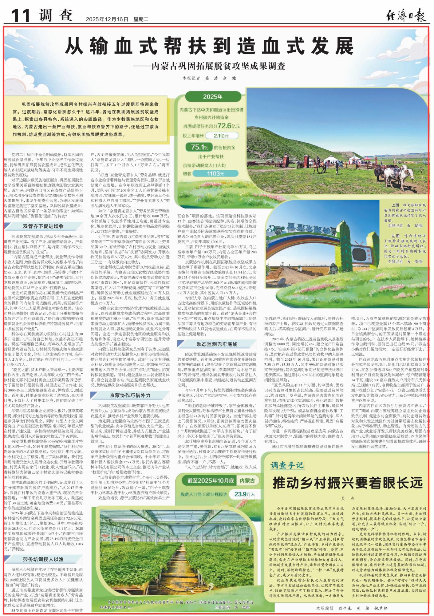 2025年12月16日,《經(jīng)濟(jì)日?qǐng)?bào)》第11版刊發(fā)題為《從輸血式幫扶到造血式發(fā)展——內(nèi)蒙古鞏固拓展脫貧攻堅(jiān)成果調(diào)查》的文章,報(bào)道了鞏固拓展脫貧攻堅(jiān)成果同鄉(xiāng)村振興有效銜接五年過渡期即將迎來收官。作為少數(shù)民族地區(qū)和農(nóng)牧地區(qū),內(nèi)蒙古走出一條產(chǎn)業(yè)幫扶、就業(yè)幫扶雙管齊下的路子,還通過京蒙協(xié)作機(jī)制、防返貧監(jiān)測(cè)等方式,有效鞏固拓展脫貧攻堅(jiān)成果。