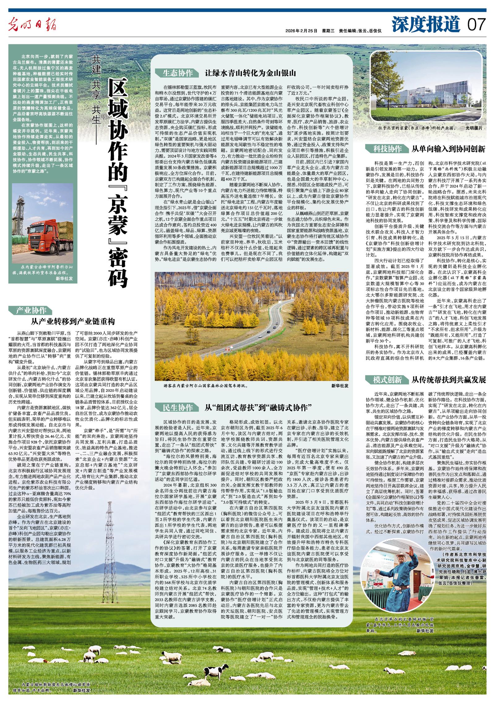 2026年2月25日《光明日?qǐng)?bào)》第7版整版刊發(fā)了《共建、共享、共生——區(qū)域協(xié)作的“京蒙”密碼》的文章,報(bào)道了聚焦民生福祉,夯實(shí)協(xié)作根基。京蒙協(xié)作始終將保障和改善民生作為出發(fā)點(diǎn)和落腳點(diǎn),通過精準(zhǔn)對(duì)接群眾需求,推動(dòng)優(yōu)質(zhì)資源對(duì)接、共享,努力提升人民的幸福感、獲得感,通過改善民生凝聚人心。