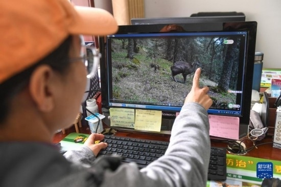 2月20日,在內(nèi)蒙古賀蘭山國家級自然保護(hù)區(qū)管理局,工作人員阿麗瑪展示紅外相機(jī)拍攝到的國家一級保護(hù)動(dòng)物馬麝。