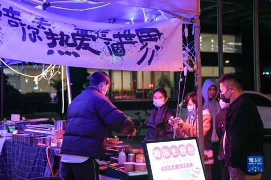 在四川省成都市錦江區(qū)三色路夜市,市民在購(gòu)買小吃(2月28日攝)。
