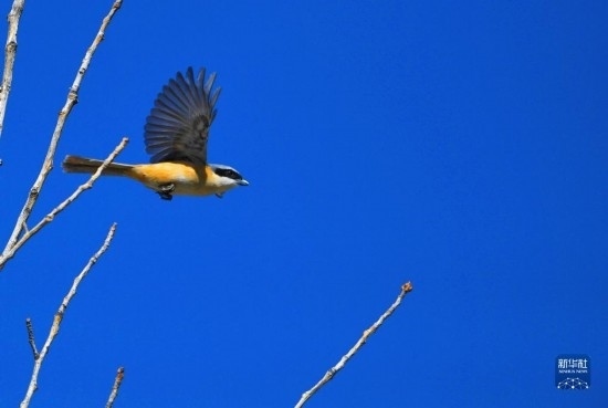 灰背伯勞在拉薩市城關區(qū)蔡公堂街道次角林村上空飛過(5月14日攝)。