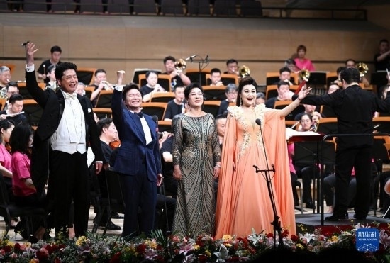 5月25日,在天津大劇院音樂廳,歌唱家王澤南(左一)、王宏偉(左二)、關牧村(左三)、張晏蓉等在舞臺上演出。