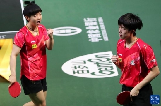 5月26日,王楚欽(右)/孫穎莎在比賽中慶祝