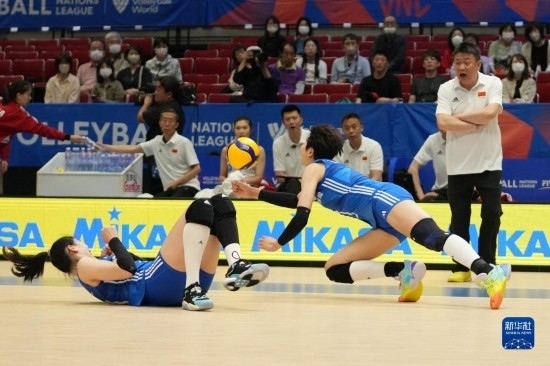 6月2日,中國隊球員袁心玥(右)在比賽中救球。新華社記者 張笑宇 攝