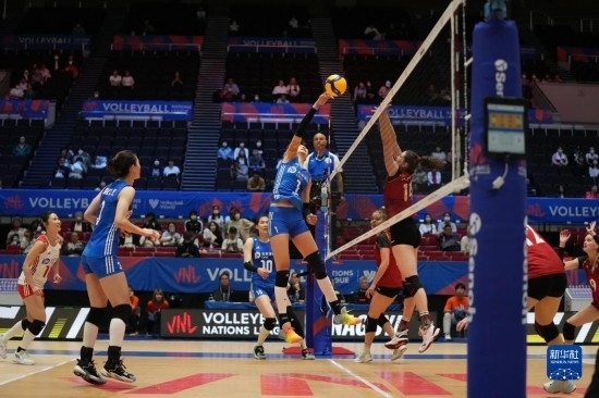 6月2日,中國隊球員袁心玥(中)在比賽中扣球。新華社記者 張笑宇 攝