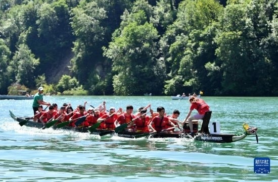 6月25日,在瑞士埃格利紹,人們參加賽龍舟活動。