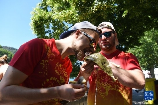 6月25日,在瑞士埃格利紹,人們在賽龍舟活動上品嘗中國粽子。