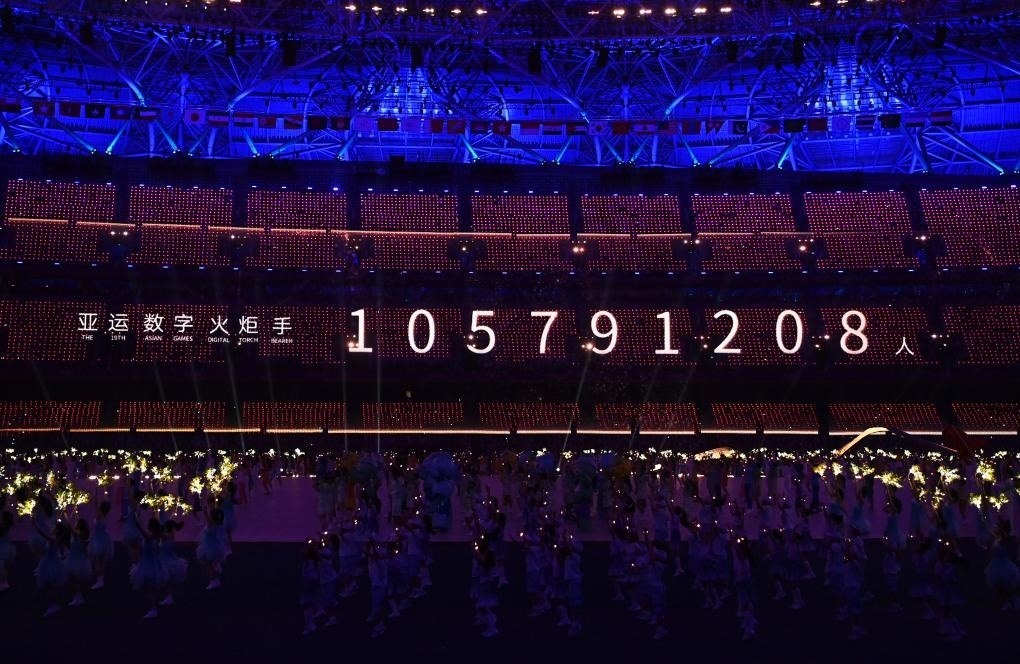 這是9月23日拍攝的開幕式現(xiàn)場(chǎng)顯示的亞運(yùn)數(shù)字火炬手人數(shù)。新華社記者 黃宗治 攝