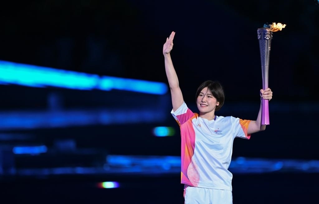 第一棒火炬手葉詩文高擎亞運(yùn)火炬入場(chǎng),樊振東、徐夢(mèng)桃、石智勇、李玲蔚、汪順5名火炬手接力奔跑,他們都曾在國際體育舞臺(tái)取得驕人成績(jī)。場(chǎng)外,光影匯聚而成的“數(shù)字火炬手”出現(xiàn)在杭城夜空。