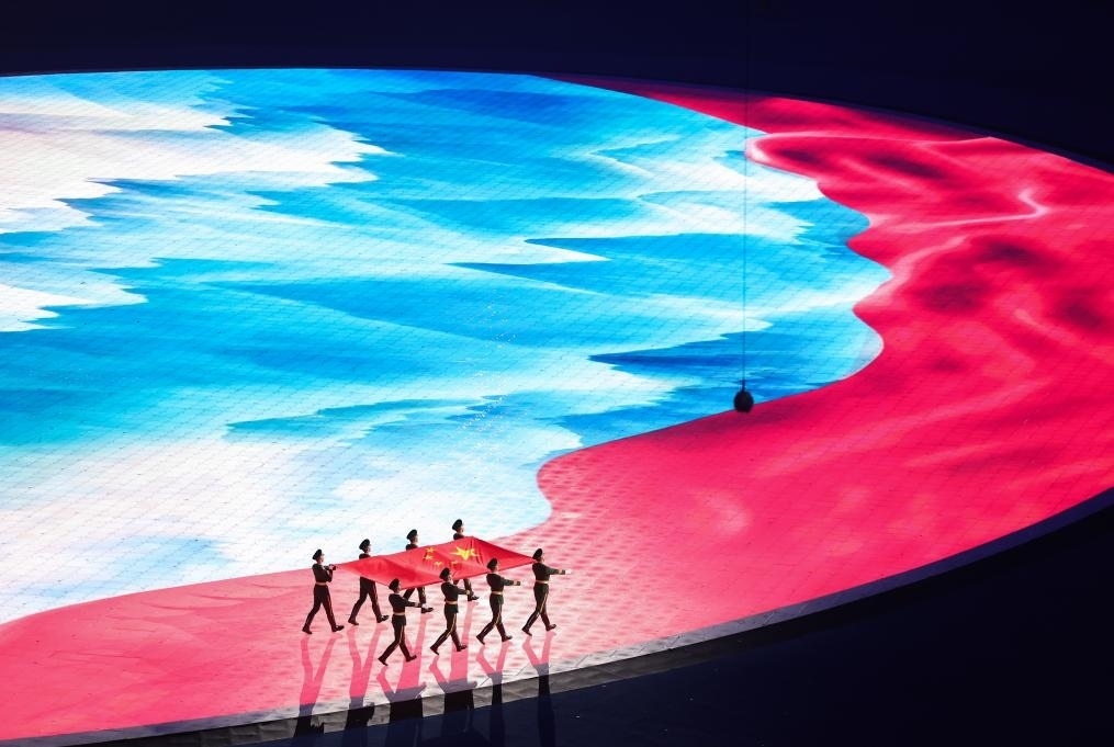 地屏上,一幅紅綢飛掠壯麗河山。8名儀仗兵步伐鏗鏘,護(hù)旗入場(chǎng)。“我愛你中國,我愛你春天蓬勃的秧苗……”動(dòng)人的贊歌深情唱響。