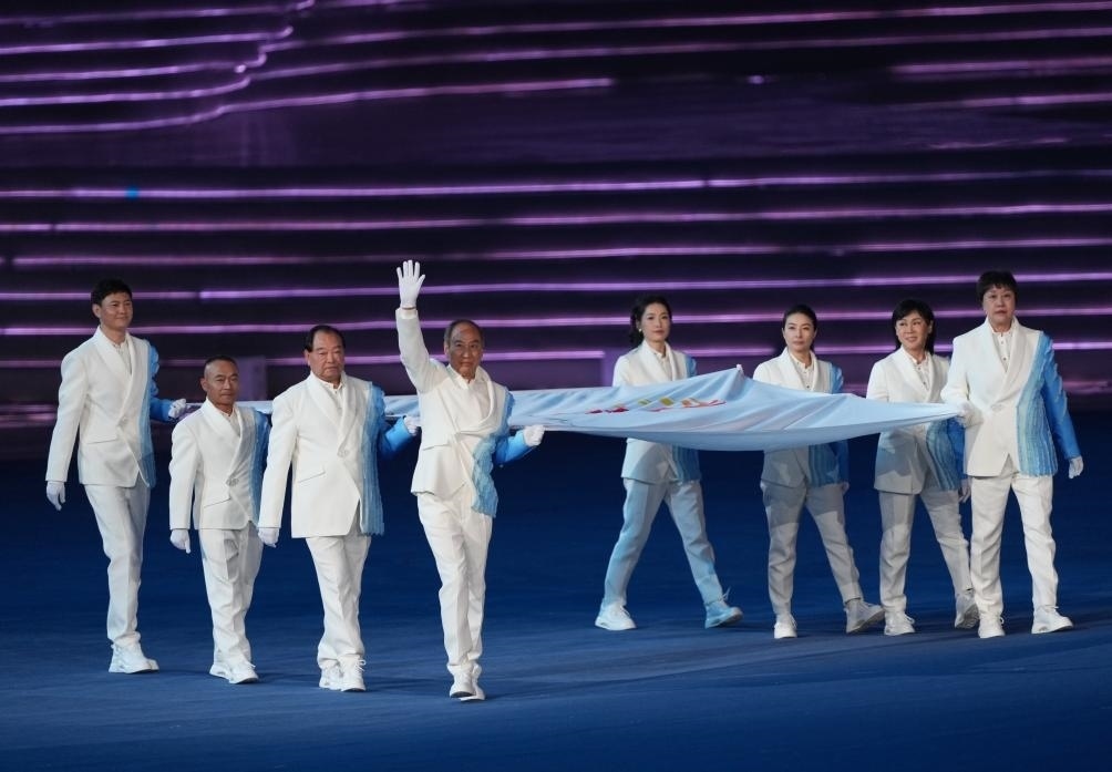 音樂響起,8名中國運(yùn)動(dòng)員、教練員代表共執(zhí)亞奧理事會(huì)會(huì)旗入場(chǎng)。伴隨著亞奧理事會(huì)會(huì)歌,會(huì)旗緩緩上升,在杭州高高飄揚(yáng)。