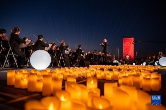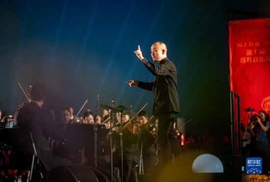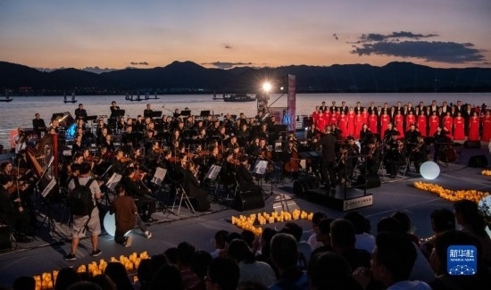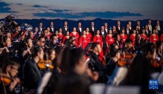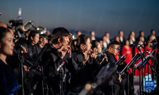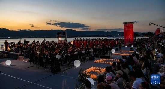 來自昆明聶耳交響樂團及昆明市民族歌舞劇院民樂團的演奏家們在昆明市滇池畔共同演奏包括《義勇軍進行曲》《賣報歌》在內的聶耳代表作(7月17日攝)。
