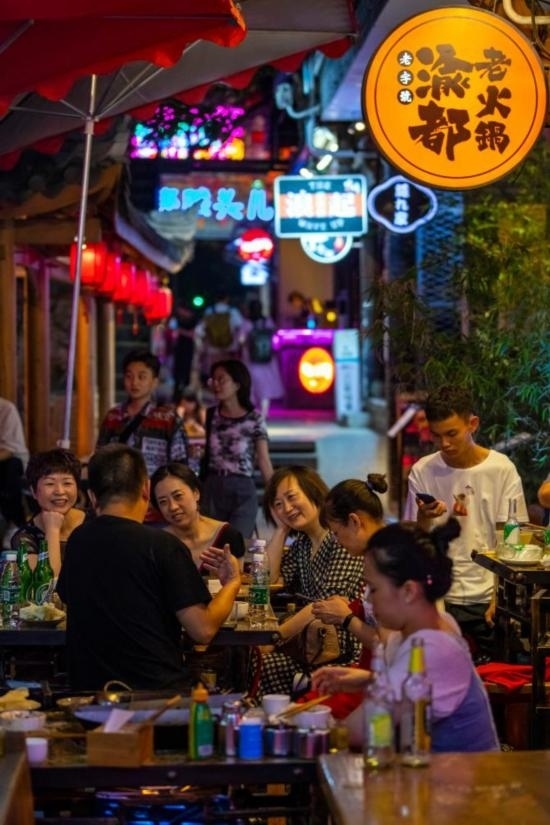 2021年7月1日,在四川省成都市成華區(qū)的猛追灣旅游休閑街區(qū),人們在美食一條街“香香巷”中吃火鍋。新華社記者 沈伯韓 攝