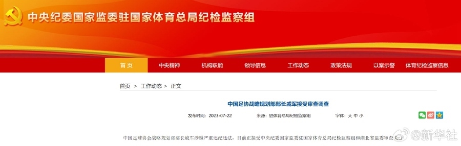 中國足球協(xié)會技術部部長譚海涉嫌嚴重違紀違法,目前正接受中央紀委國家監(jiān)委駐國家體育總局紀檢監(jiān)察組和湖北省監(jiān)委審查調查。中國足球協(xié)會戰(zhàn)略規(guī)劃部部長戚軍涉嫌嚴重違紀違法,目前正接受中央紀委國家監(jiān)委駐國家體育總局紀檢監(jiān)察組和湖北省監(jiān)委審查調查。(中央紀委國家監(jiān)委駐國家體育總局紀檢監(jiān)察組)