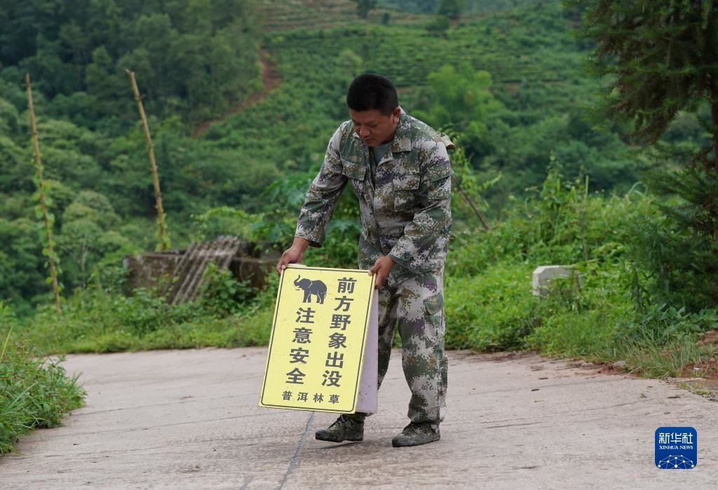 一名監(jiān)測(cè)員在野象活動(dòng)區(qū)域一處道路上設(shè)置警示牌(7月19日攝)。