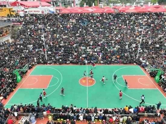 這是3月27日在貴州省黔東南州臺(tái)江縣臺(tái)盤(pán)村拍攝的貴州省首屆“美麗鄉(xiāng)村”籃球聯(lián)賽總決賽比賽現(xiàn)場(chǎng)(無(wú)人機(jī)照片)。新華社記者歐東衢攝