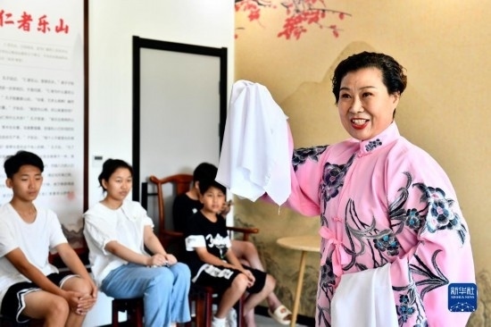 8月9日,在棗莊市市中區(qū)龍山路街道辛莊社區(qū),棗莊市藝術(shù)劇院柳琴戲市級非遺傳承人郭曉玲在指導(dǎo)孩子學習柳琴戲。