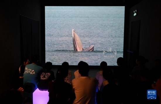 8月26日,游客在國(guó)家海洋博物館“鯨奇物語”展區(qū)觀看鯨魚相關(guān)科普視頻。