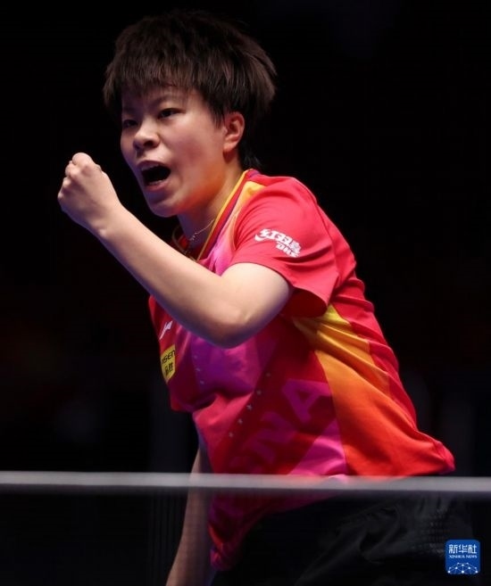 世乒賽|乒乓球——中國女團(tuán)晉級(jí)決賽 2月23日,王藝迪在第三盤比賽中慶祝得分。她3比0戰(zhàn)勝法......