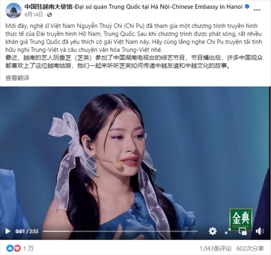 中國(guó)駐越南大使館Facebook發(fā)文點(diǎn)贊越南藝人芝芙在《乘風(fēng)2023》傳播中越文化。