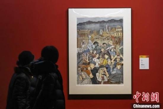觀(guān)眾在江蘇省美術(shù)館展廳內(nèi)欣賞展出的版畫(huà)作品。 中新網(wǎng)記者 泱波 攝