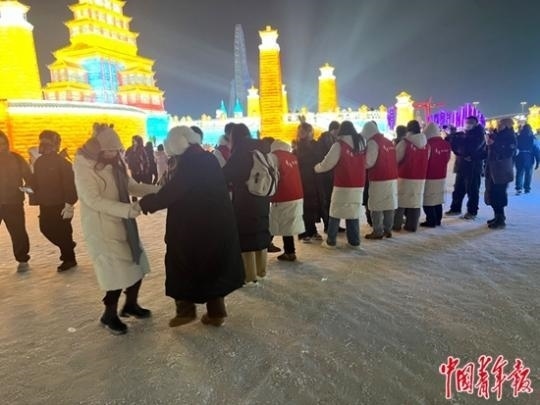 1月4日,哈爾濱冰雪大世界,大學生志愿者與游客一起跳兔子舞。中青報·中青網記者 金卓攝