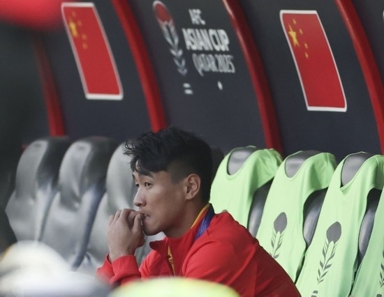 1月13日,中國隊對陣塔吉克斯坦隊,圖為因傷未能進入名單的韋世豪賽前在替補席上。新華社記者 曹燦 攝