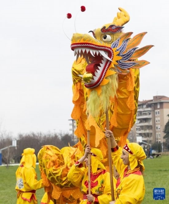 這是2月4日在意大利斯坎迪奇排球俱樂部主場體育館外拍攝的舞龍表演。新華社記者 李京 攝