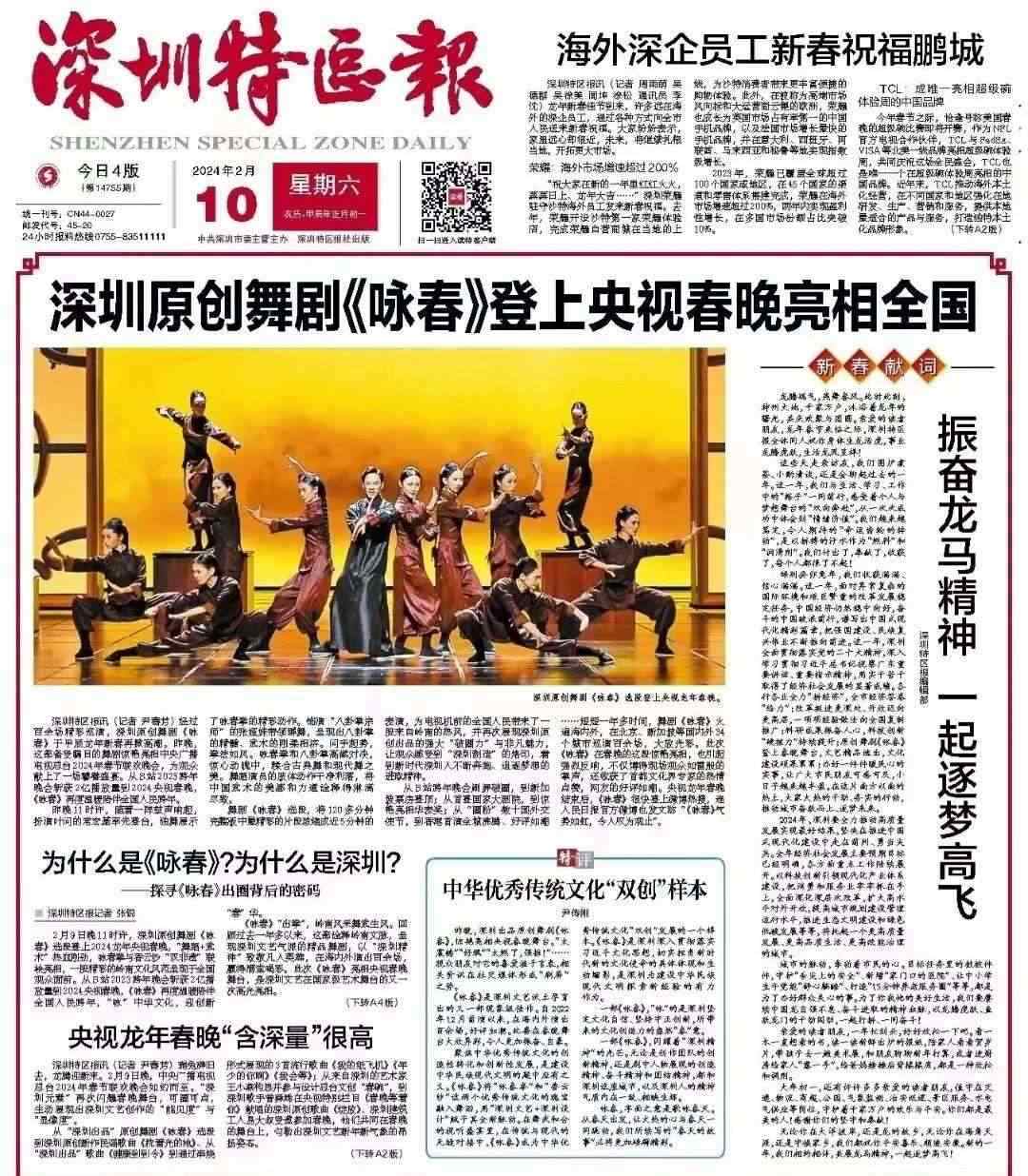 《深圳特區(qū)報(bào)》在大年初一頭版頭條對(duì)《詠春》做了報(bào)道。光明日?qǐng)?bào)原總編輯何東平等首都文化界專(zhuān)家學(xué)者在采訪中紛紛為《詠春》成功登陸春晚大舞臺(tái)而點(diǎn)贊。