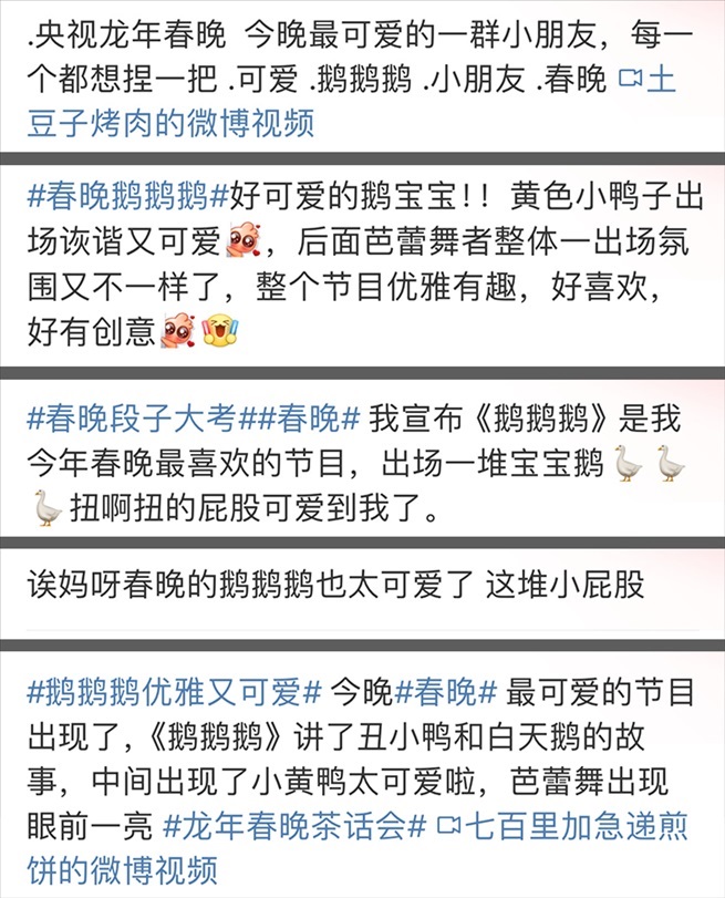 當(dāng)你提“鵝鵝鵝”,自然要期待“曲項(xiàng)向天歌”。駱賓王、唐詩(shī)宋詞、中華文化....看到節(jié)目單上的題目《鵝鵝鵝》,大概很多觀眾都以為是要詠詩(shī)。當(dāng)大幕開(kāi)啟,柴可夫斯基的《天鵝湖》奏起,氣氛瞬間變得端莊典雅了,可接下來(lái)出場(chǎng)的是一群圓滾滾、扭著屁股的小小鵝,這波反差萌,讓網(wǎng)友直呼“創(chuàng)意絕了”。