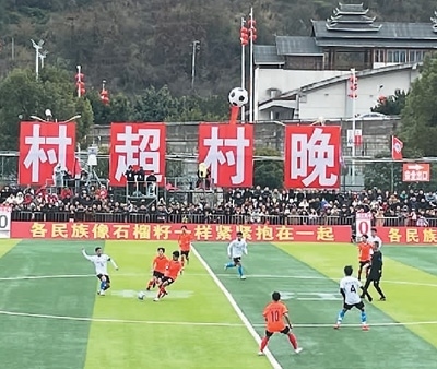 “村超”是指由當(dāng)?shù)厝罕娮詣?chuàng)舉辦的“貴州榕江(三寶侗寨)和美鄉(xiāng)村足球超級聯(lián)賽”。2023年初,文化和旅游部下發(fā)文件,鼓勵各地開展“四季村晚”活動。