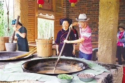 游客在景區(qū)體驗(yàn)古法手工紅糖制作工藝。 韋芳蘭攝 |