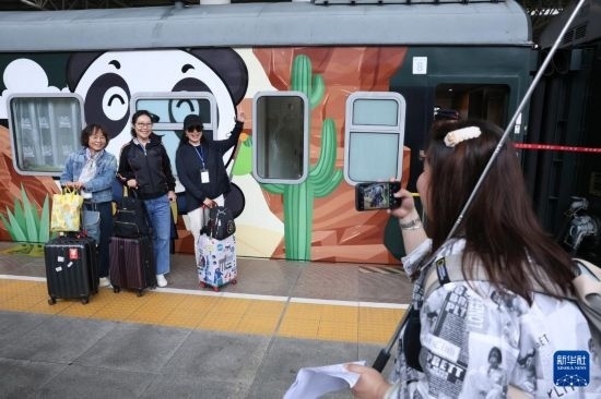 5月8日,旅客在“熊貓專(zhuān)列”前拍照留念。