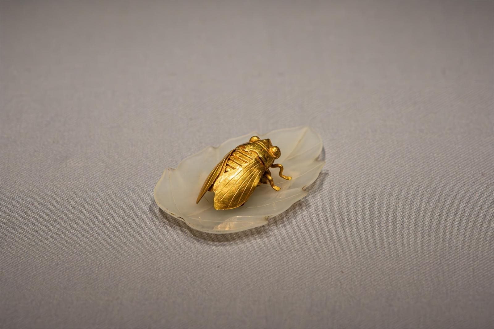 金蟬玉葉是南京博物院的鎮(zhèn)院之寶之一,是500年前貴族女子發(fā)髻上的一件時尚單品。在《玉潤中華——中國玉器的萬年史詩圖卷》大展上,它也是“網(wǎng)紅文物”之一。形神畢肖、金光閃耀的蟬棲憩在玉葉上,它嘴巴微張好似在奏鳴,玉葉葉脈分明,細(xì)薄呈凹弧狀,經(jīng)鑒定金蟬含金量達(dá)到95%,而蟬翼厚度僅為0.2毫米,工藝精致且繁復(fù)。