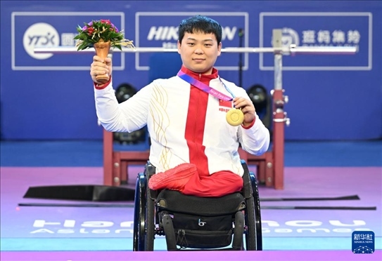 圖為2023年10月24日,中國(guó)選手齊勇凱在杭州第4屆亞殘運(yùn)會(huì)舉重項(xiàng)目男子59公斤級(jí)頒獎(jiǎng)儀式上。新華社記者 貝赫 攝