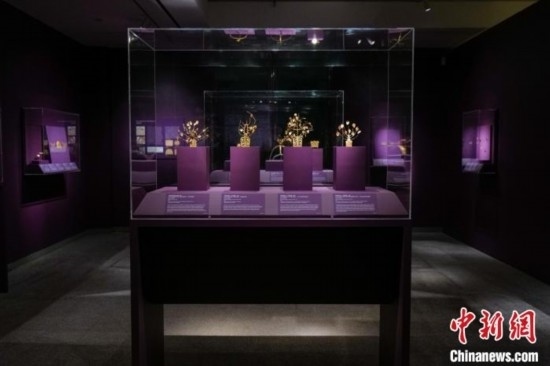 當(dāng)?shù)貢r(shí)間9月4日,百余件遼寧三燕文物亮相紐約華美協(xié)進(jìn)社中國(guó)美術(shù)館秋季特展《龍城之金:遼寧三燕文物選萃,337-436》。圖為展覽現(xiàn)場(chǎng)的金步搖。 中新社記者 王帆 攝