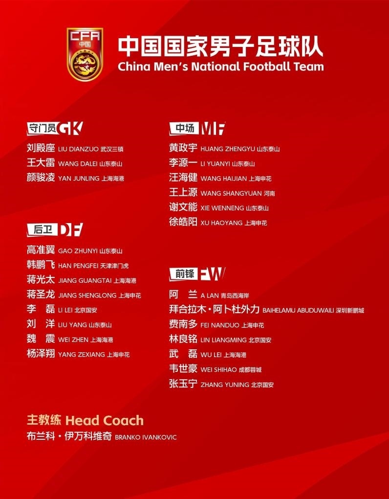 以下為24人大名單:武磊、顏駿凌、蔣光太、魏震(上海海港),王大雷、劉洋、高準(zhǔn)翼、黃政宇、謝文能、李源一(山東泰山),韋世豪(成都蓉城),費(fèi)南多、蔣圣龍、徐皓陽(yáng)、楊澤翔、汪海?。ㄉ虾I昊ǎ罾?、張玉寧、林良銘(北京國(guó)安),劉殿座(武漢三鎮(zhèn)),韓鵬飛(天津津門虎),王上源(河南),拜合拉木·阿卜杜外力(深圳新鵬城),阿蘭(青島西海岸)。
