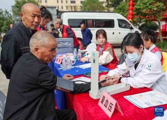 10月9日,在河西埭村文化禮堂前,醫(yī)務(wù)人員在給老人們免費(fèi)體檢。