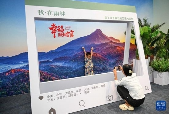 10月13日,在“守護(hù)雨林家園——海南熱帶雨林國(guó)家公園建設(shè)主題展”現(xiàn)場(chǎng),觀眾與海南熱帶雨林背景墻留影。