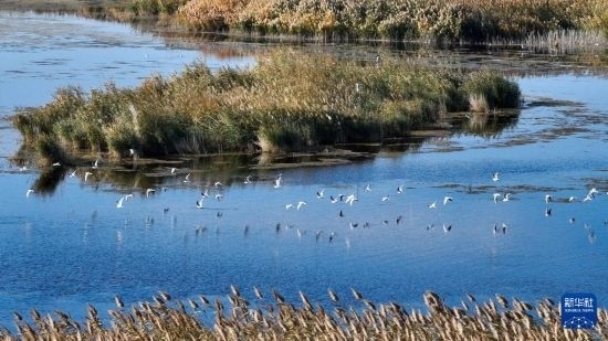 10月14日在居延海景區(qū)拍攝的水鳥(niǎo)(無(wú)人機(jī)照片)。