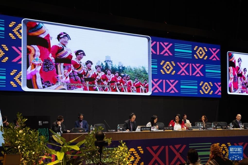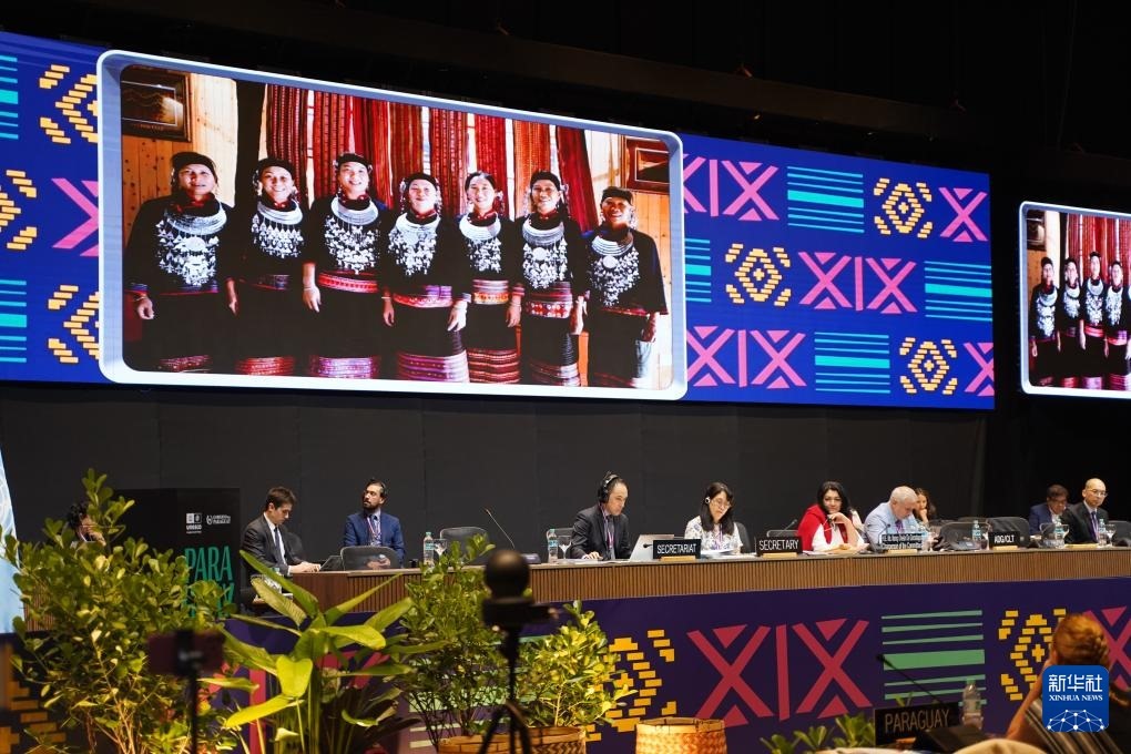 12月5日,在巴拉圭亞松森聯(lián)合國教科文組織保護(hù)非物質(zhì)文化遺產(chǎn)政府間委員會第19屆常會評審現(xiàn)場,大屏幕播放“黎族傳統(tǒng)紡染織繡技藝”宣傳視頻。新華社記者 朱雨博 攝