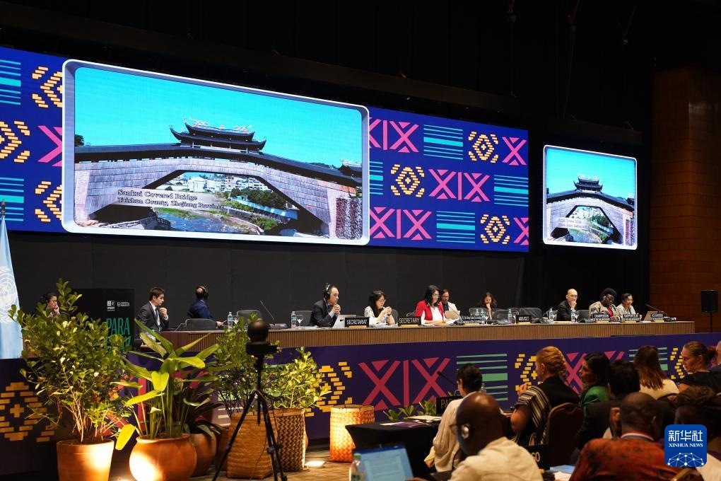 12月5日,在巴拉圭亞松森聯(lián)合國教科文組織保護(hù)非物質(zhì)文化遺產(chǎn)政府間委員會第19屆常會評審現(xiàn)場,大屏幕播放“中國木拱橋傳統(tǒng)營造技藝”宣傳視頻。新華社記者 朱雨博 攝