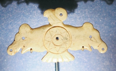 玉鷹是凌家灘文化最具代表性的器物之一。鷹側(cè)首傲視,雙翅張開,翅端各為一豬首形象,可能以豬作為財(cái)富的象征。鷹腹刻八角星紋,這種紋樣在凌家灘出土的玉版和新石器時(shí)代眾多陶器上都有出現(xiàn)。這件玉鷹可能是舉行祭祀儀式時(shí)所用之物,鷹、豬、八角星紋集于一器,體現(xiàn)了先民崇尚萬物有靈的宇宙觀。