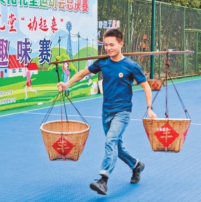 在白沙村舉辦的浙江省農(nóng)村文化禮堂運(yùn)動會總決賽上,村民參與挑扁擔(dān)比賽。